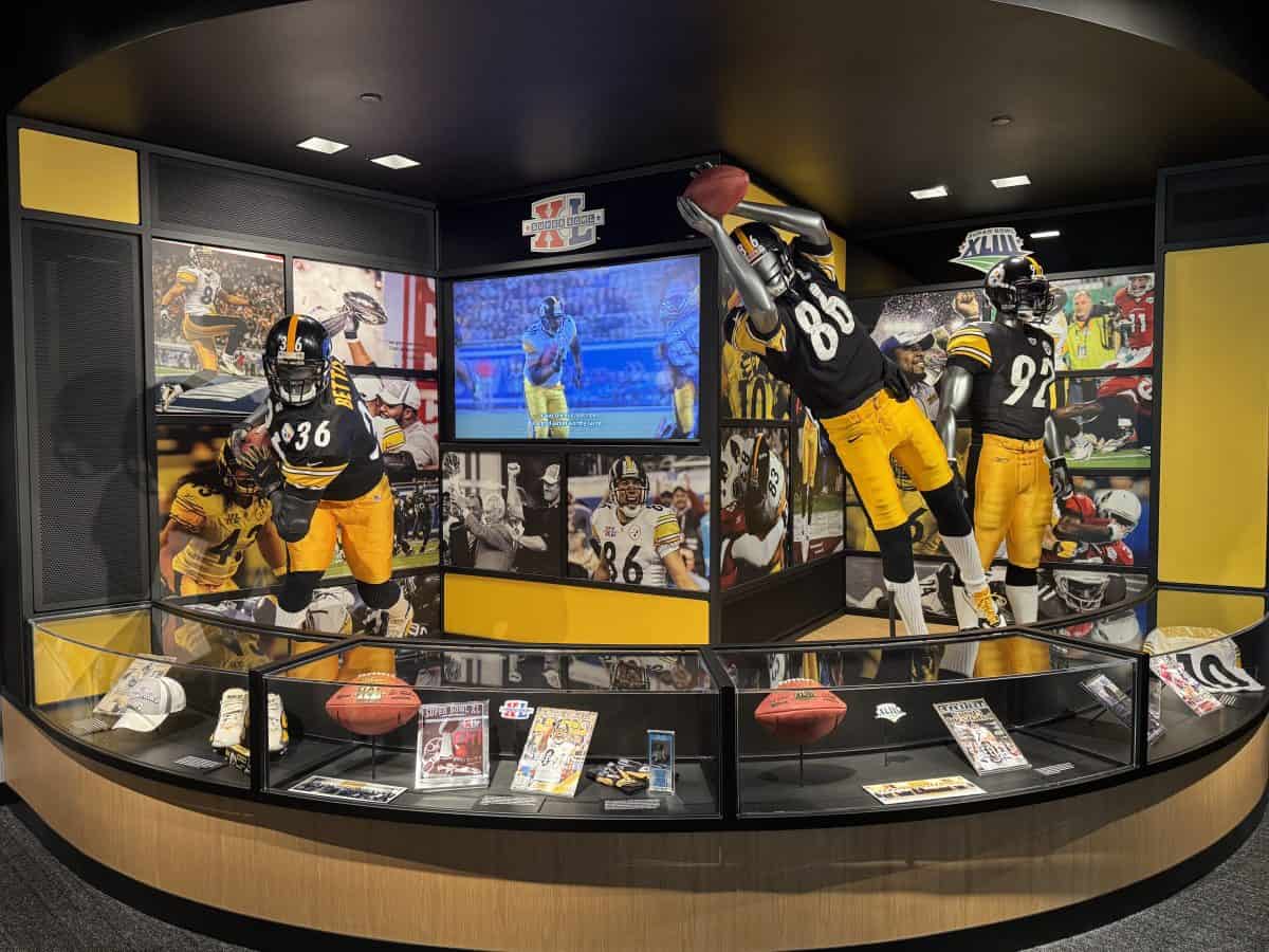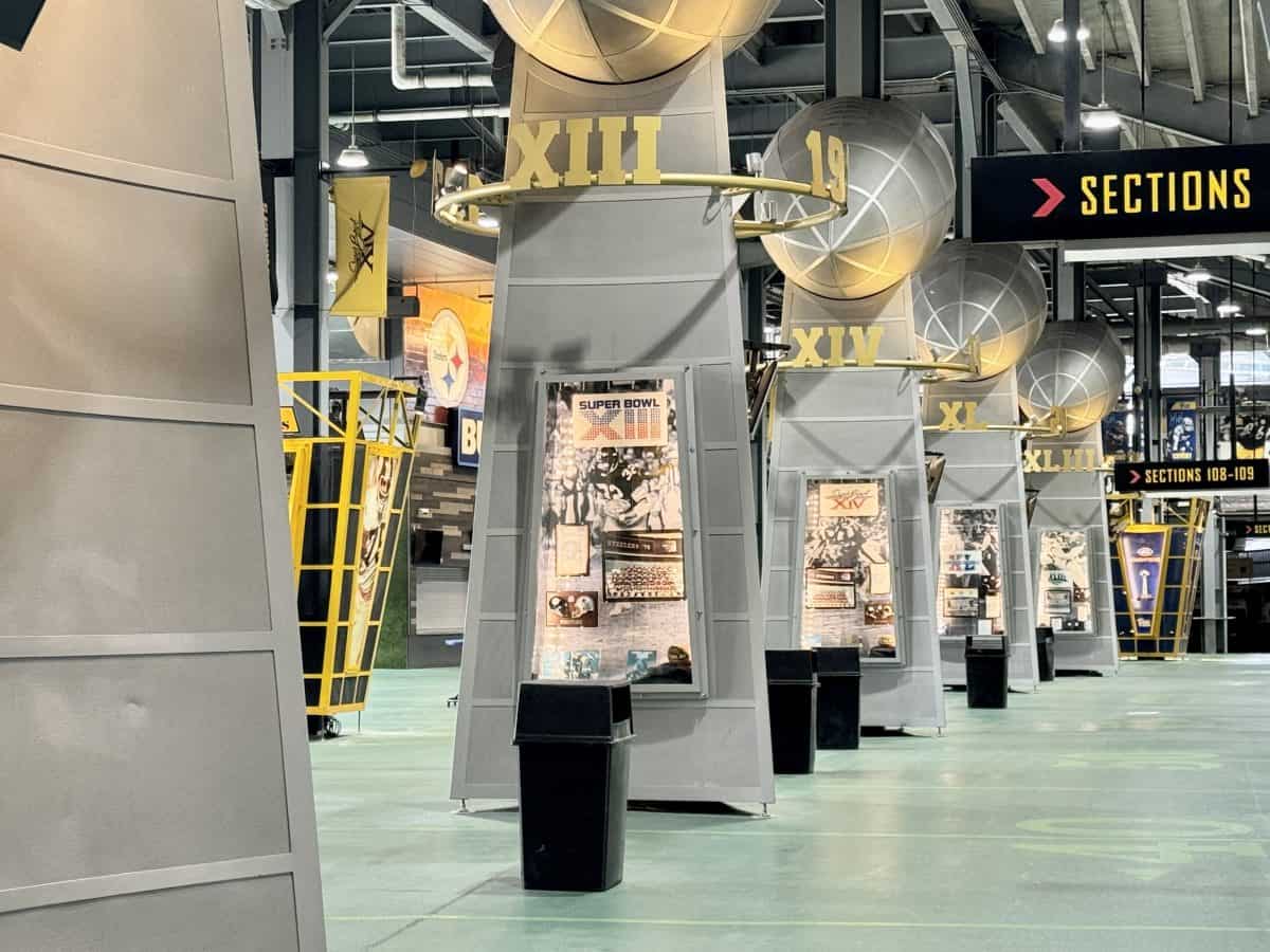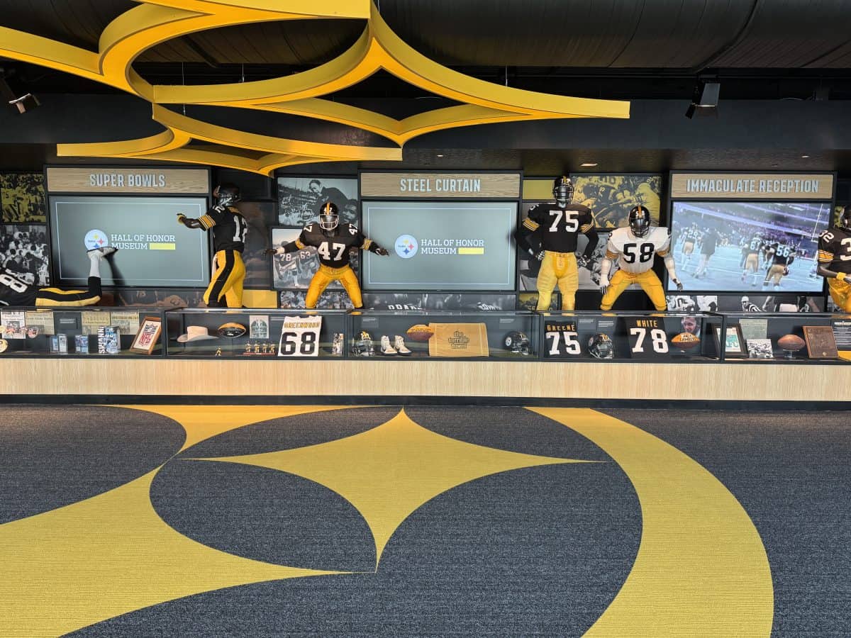 - The Great Hall: See all six columns that display the Steelers’ six Vince Lombardi trophies, as well displays featuring old uniforms and the jerseys of the three retired Steelers players: Ernie Stantree, Joe Green, and Franco Harris.