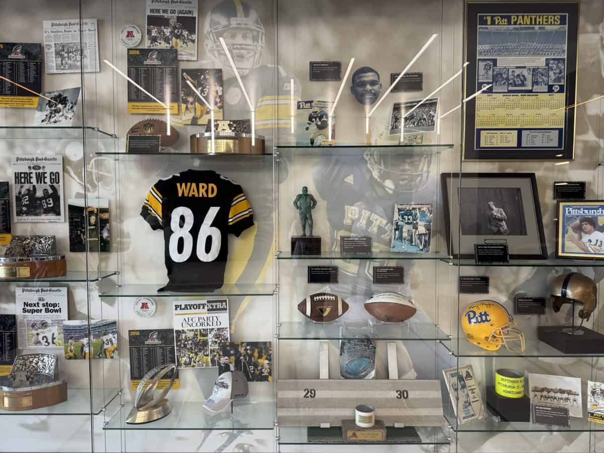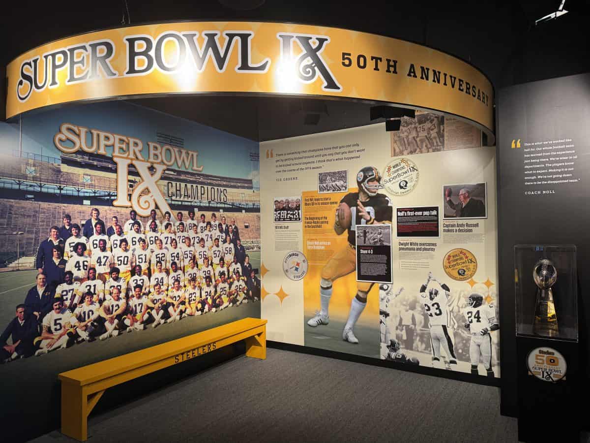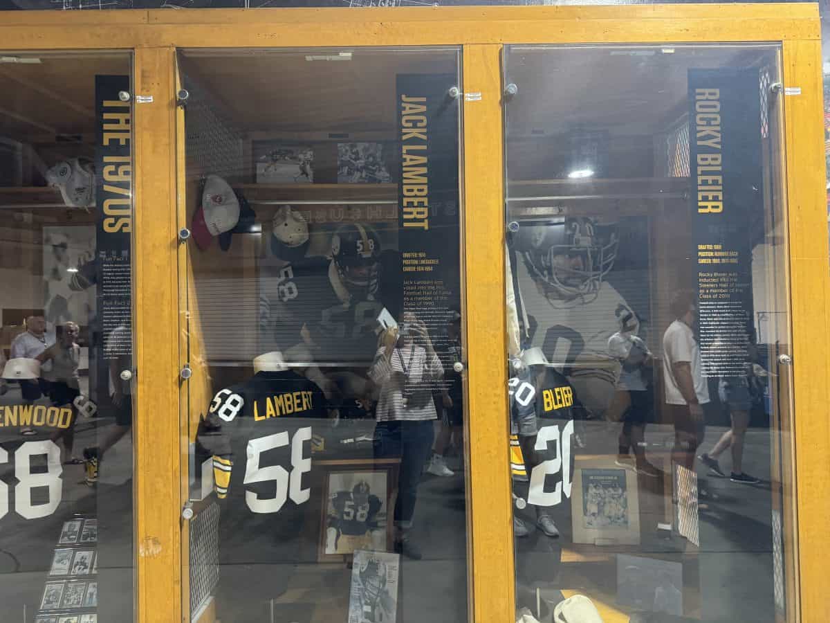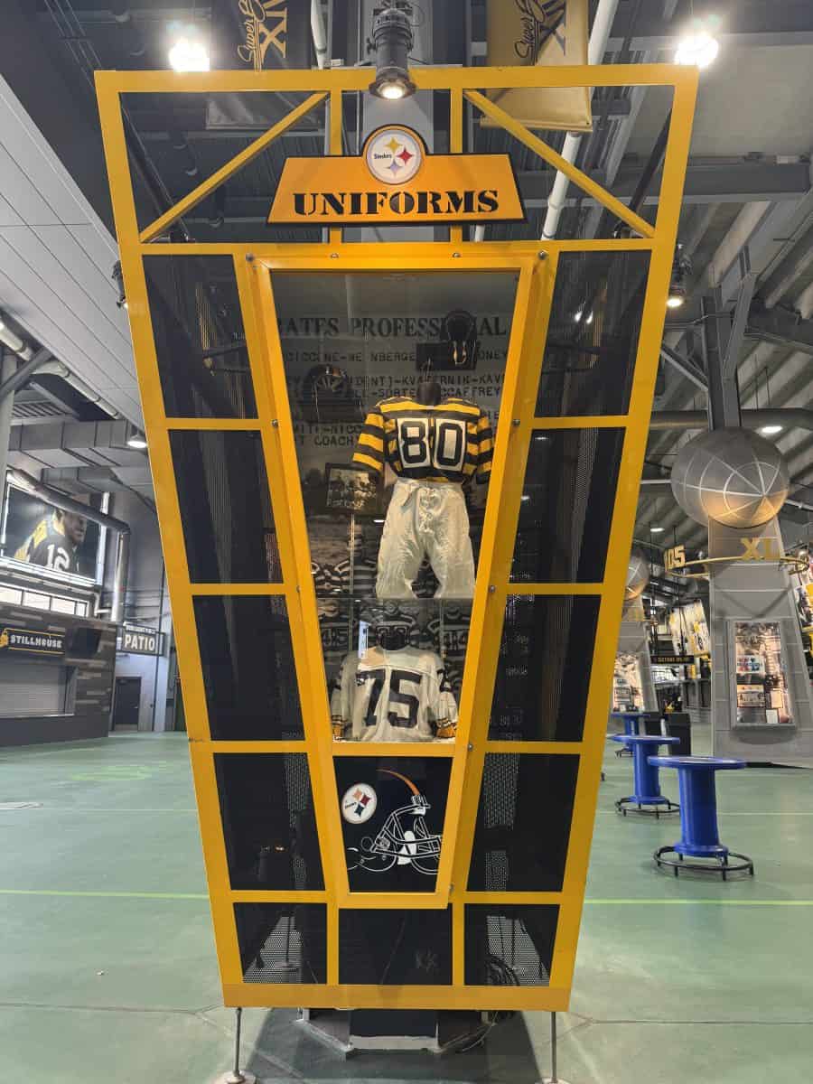 - The Great Hall: See all six columns that display the Steelers’ six Vince Lombardi trophies, as well displays featuring old uniforms and the jerseys of the three retired Steelers players: Ernie Stantree, Joe Green, and Franco Harris.