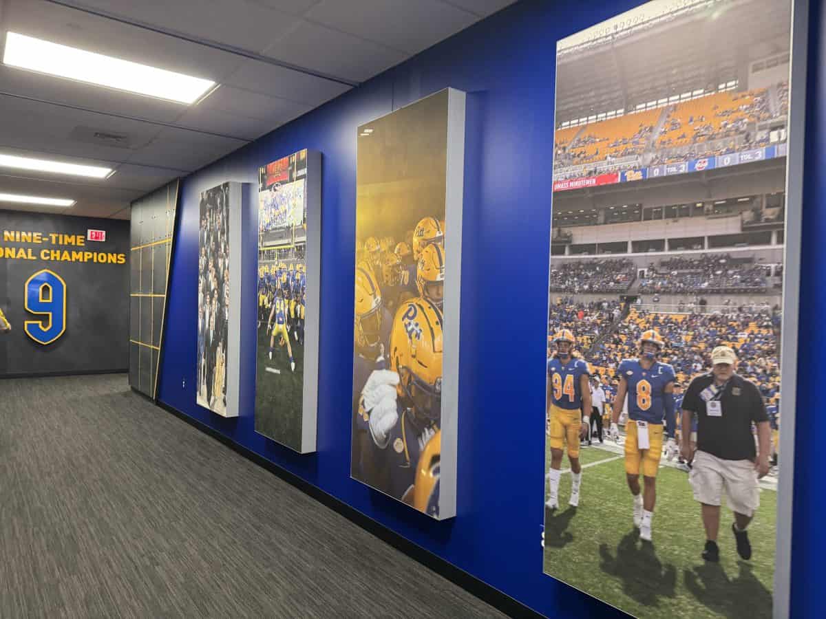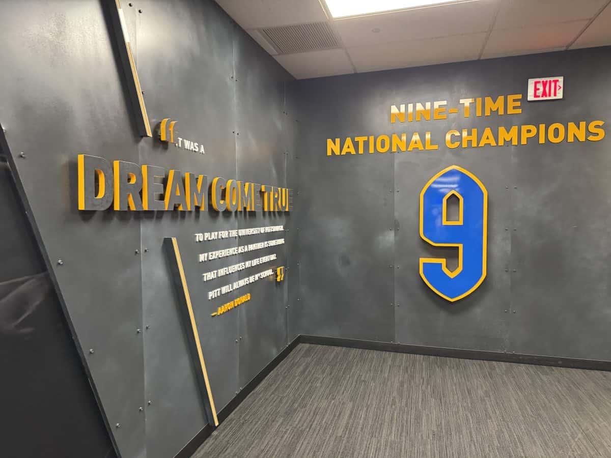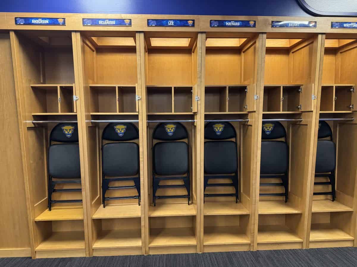 - The locker rooms for both the Pittsburgh Steelers and the UPitt Panthers: Be sure NOT to step on the logos in the carpet- it’s bad luck! The Panthers’ locker room has a total of 90 player lockers and the Steelers’ locker room has 53 players lockers, all assigned by position.