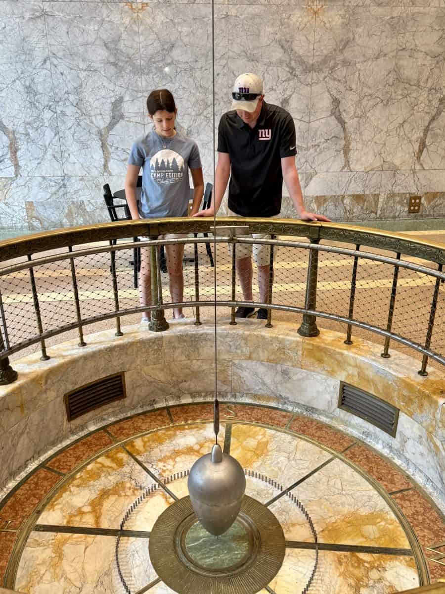- Look down at the 150 pound Foucault Pendulum that demonstrates the Earth’s rotation. The 136 pins that make a circular border around the pendulum have to be reset everyday, since a full rotation of the pendulum knocks them down every 10.5 hours.