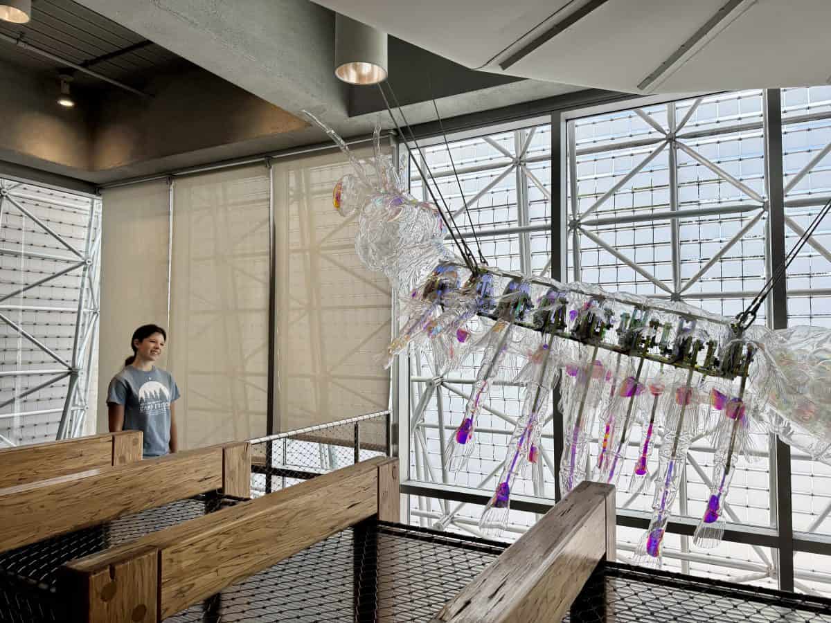 - Step on the platform to make Lily fly. The giant brine shrimp (720 times larger than a real shrimp!) was created by artist Asia Ward as part of the museum’s Tough Art Residency and is made entirely of recycled plastic.