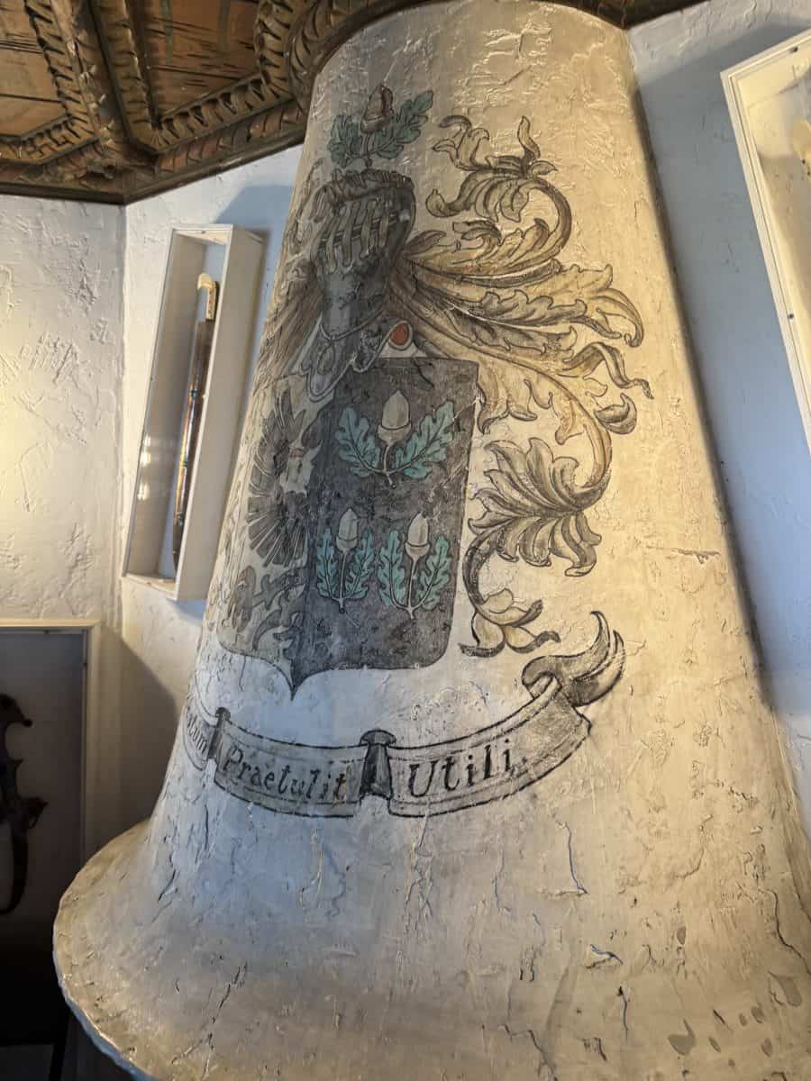 - The commissioned Coat of Arms for the family, “Honor Before Expedience” painted in Tiffany blue on the fireplace in the Dining Room.