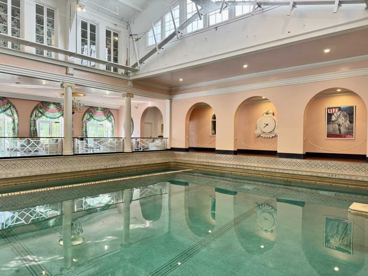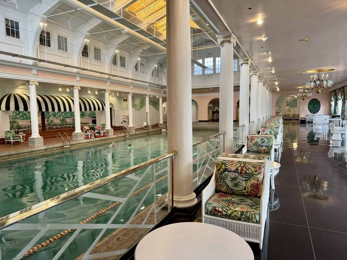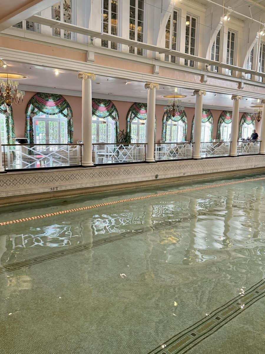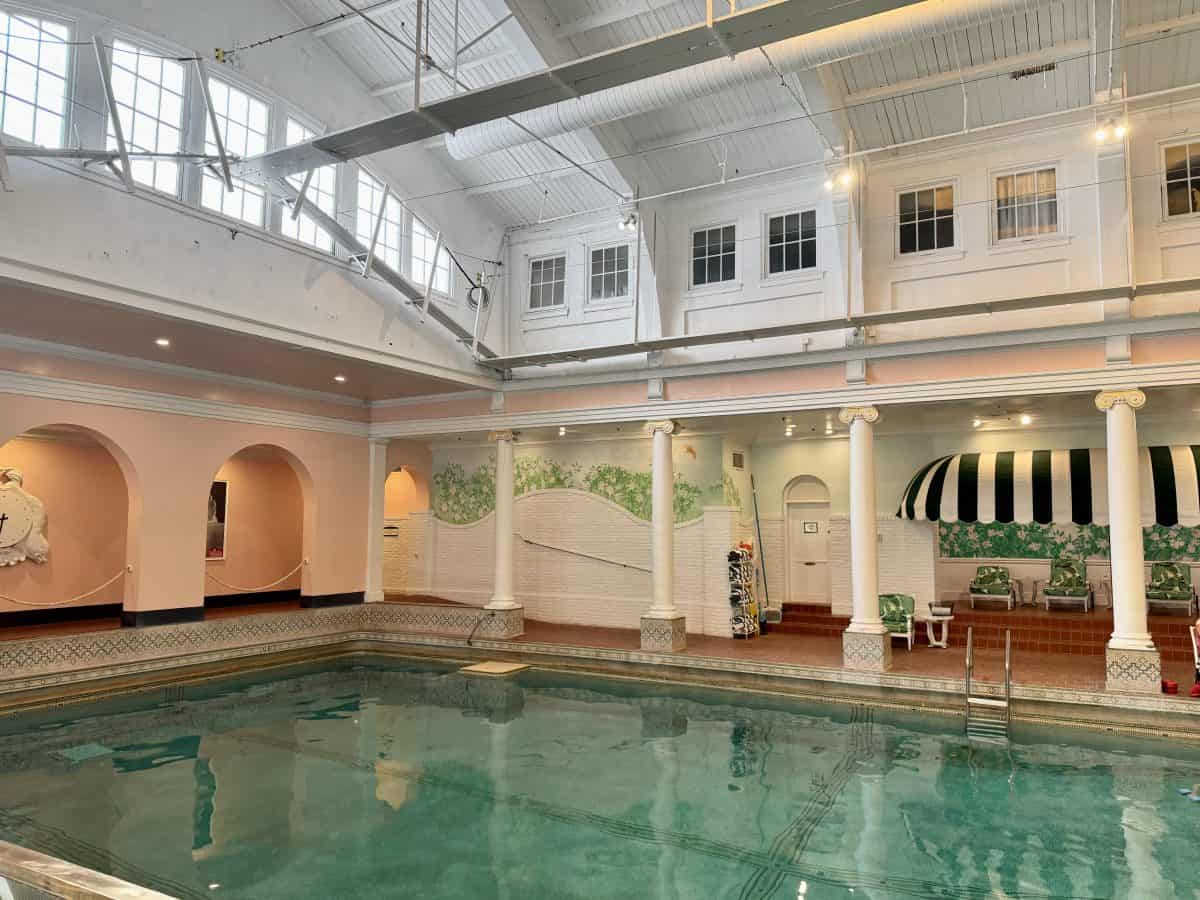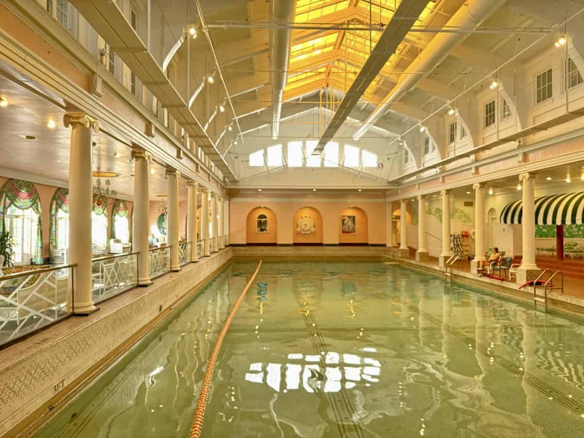 - Go swimming in the indoor pool (open daily from 8am-4pm) and outdoor pool (open seasonally from 9am-8pm): The 30 meter indoor pool, which dates back to 1912 and has been meticulously restored and preserved, is a beautiful, sun filled space, with a three foot shallow end, and nine foot deep end. There are well appointed locker rooms and a full gym set up inside the pool facility. The outdoor, zero entry, infinity ledge pool that overlooks the golf course, is located to the left of the Golf Shop. There is plenty of tiered shaded seating available, locker rooms and a retail shop, a couple of water features kids will enjoy, and the Tree Tops Cafe.