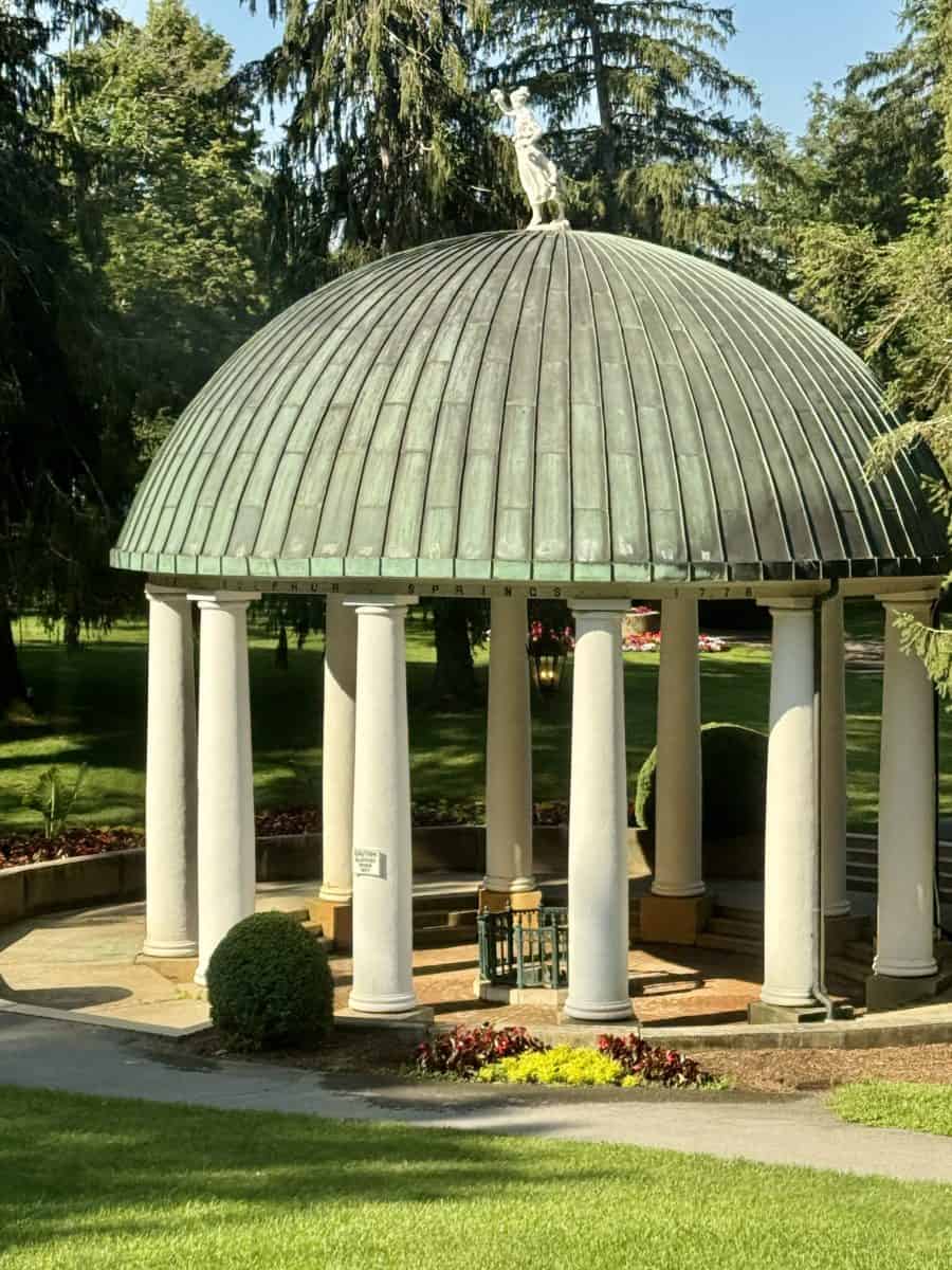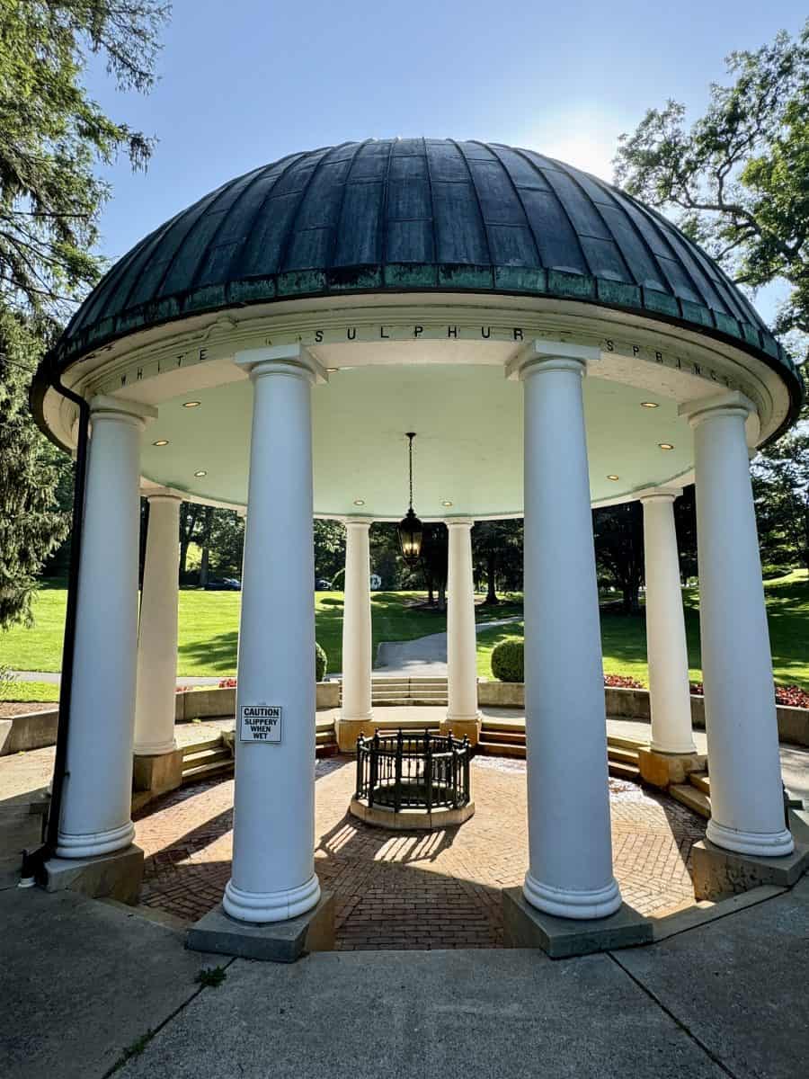 - Peer down into the Springhouse well: The resort was built on the site of the White Sulphur Hot Springs, which attracted visitors looking to cure their ailments as far back as the late 1700s. The Springhouse (icon of the resort), built in the 1830s as the resort grew in popularity as people who come to drink from it each morning, “reflects the Greek and Roman ancestry of ‘taking the waters’ to restore health.” Sulphur water from this springhouse is still pumped to the Spa, which offers dozens of treatments.
