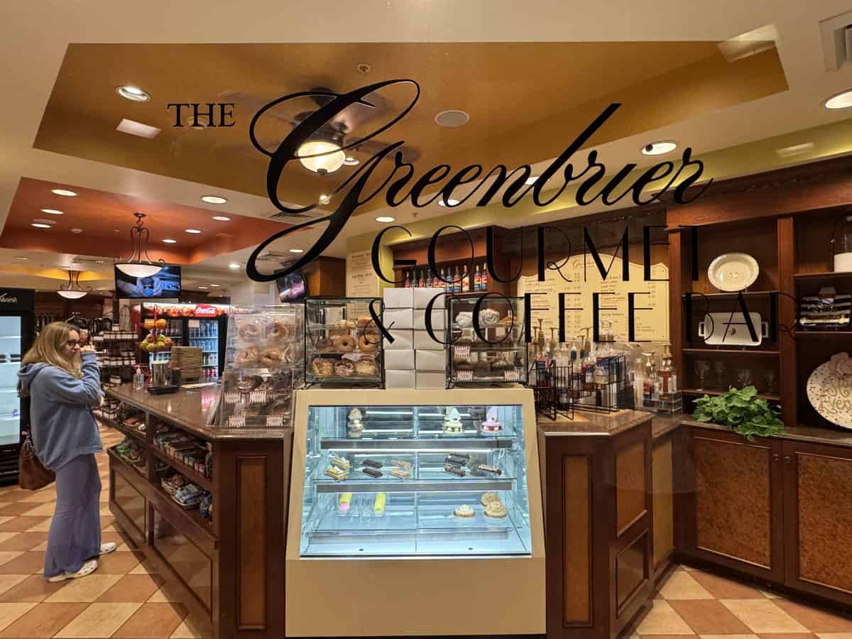 - The Greenbrier Gourmet and Coffee Bar: Offering freshly made pastries, sandwiches, and snacks, and plenty of hot and cold drink options and treats for the kids; located on the LowerLobby/Shop Level; walk in only; typically open at 7am; menu here.